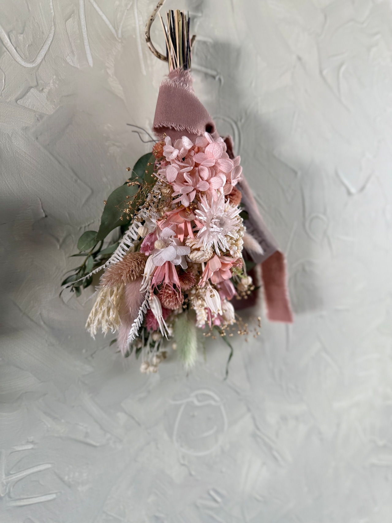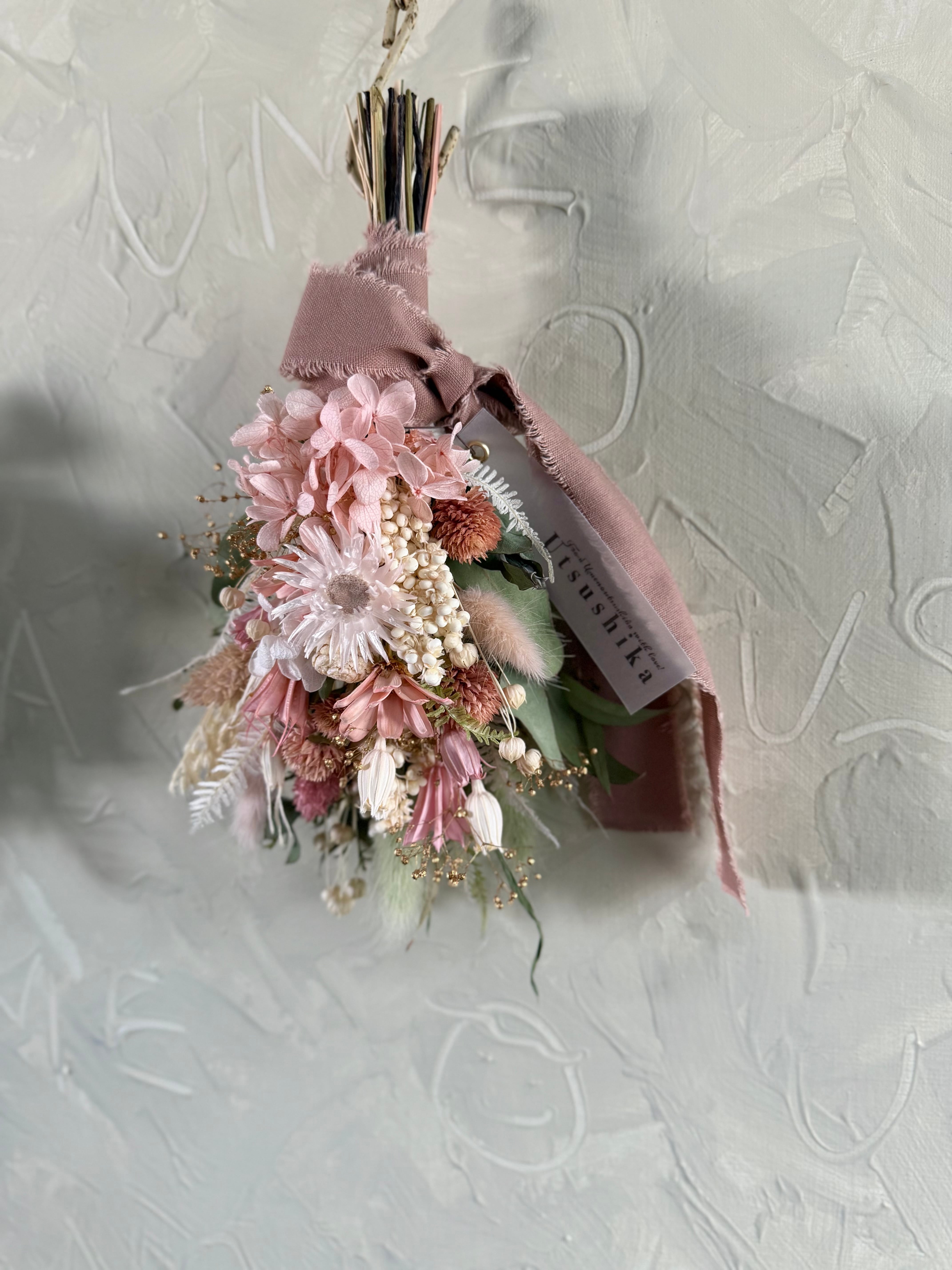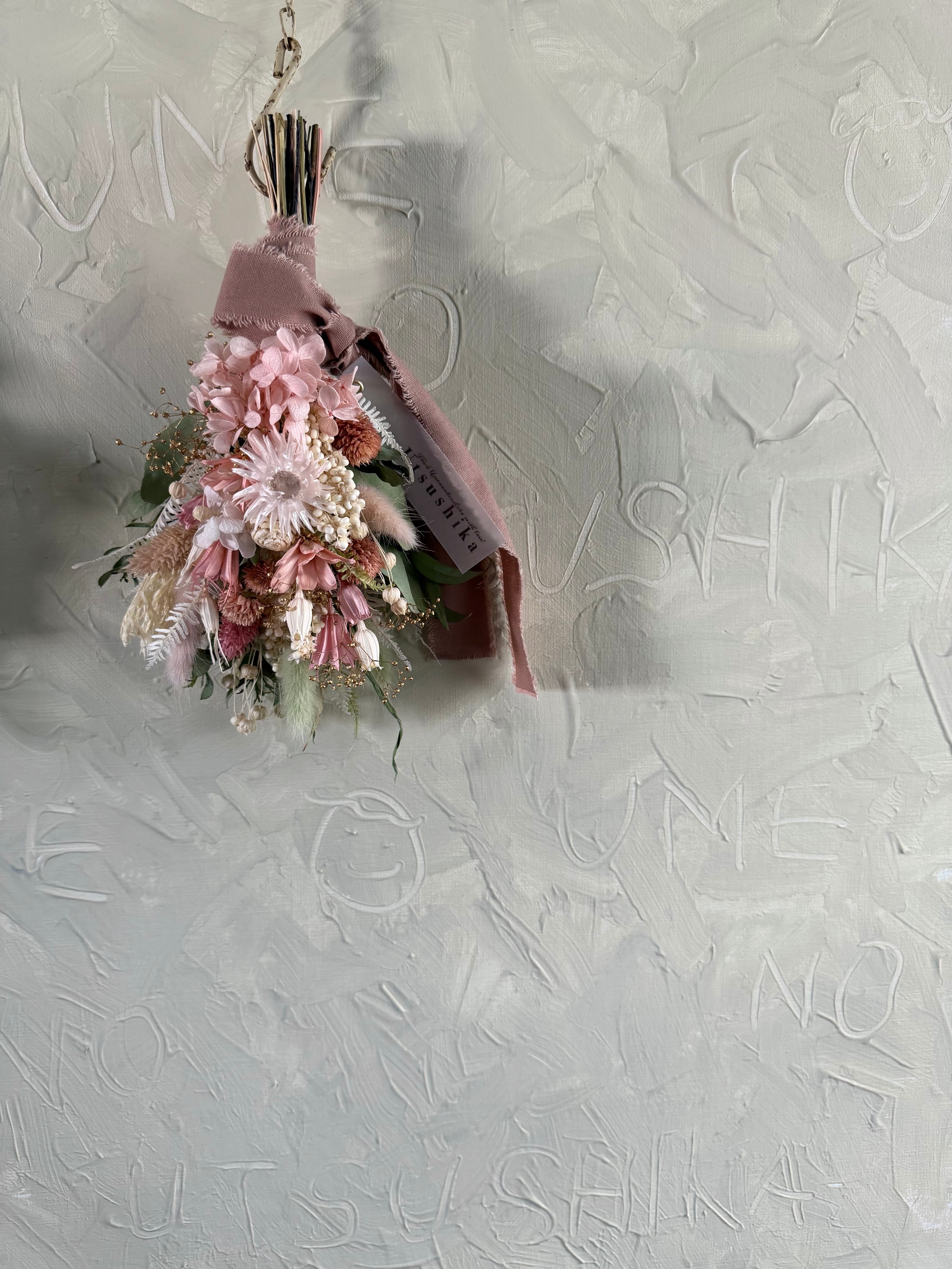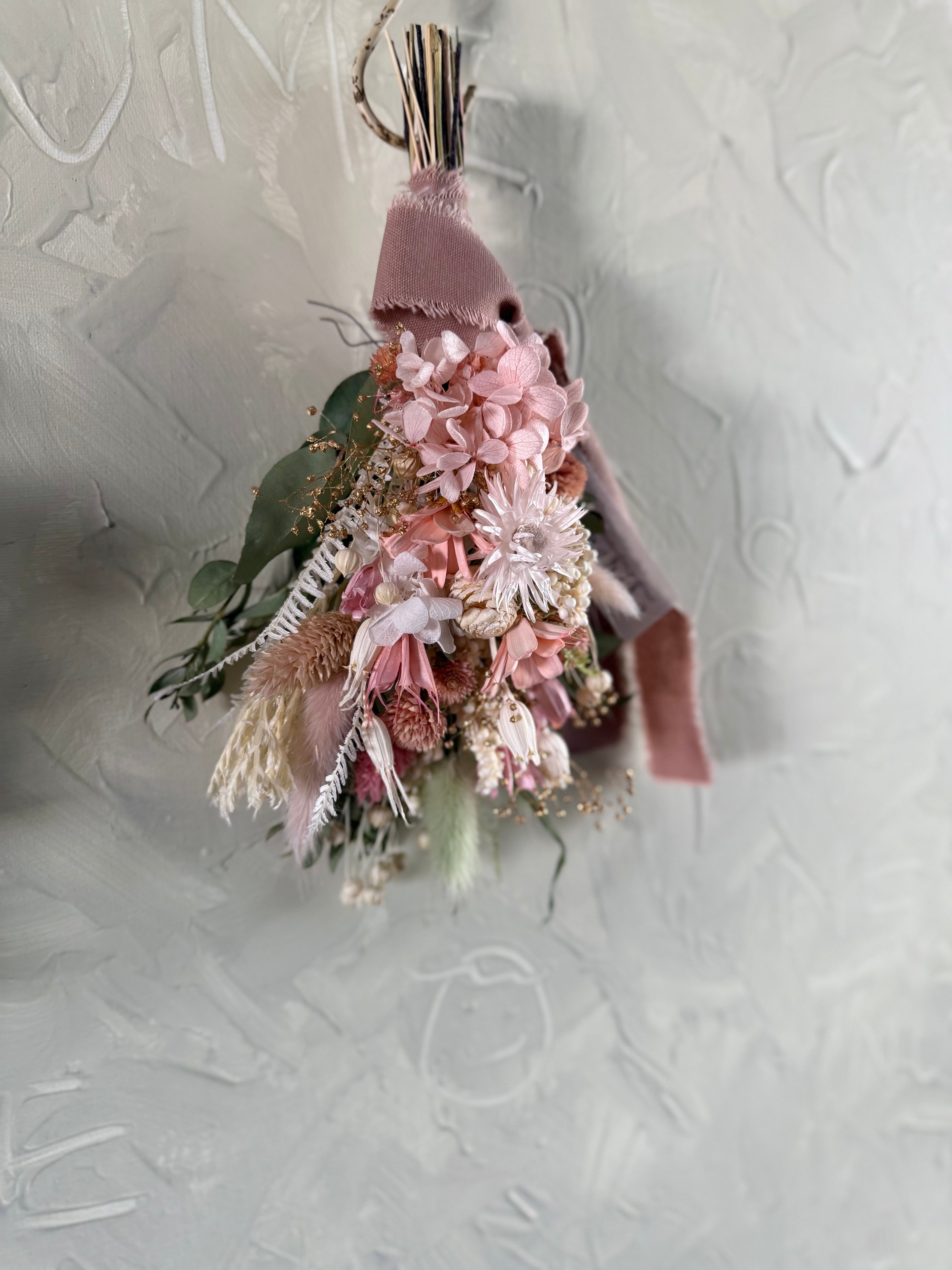 ピンクの紫陽花をメインに、ゴールドを差し色で華やかに仕上げました。