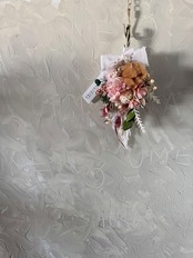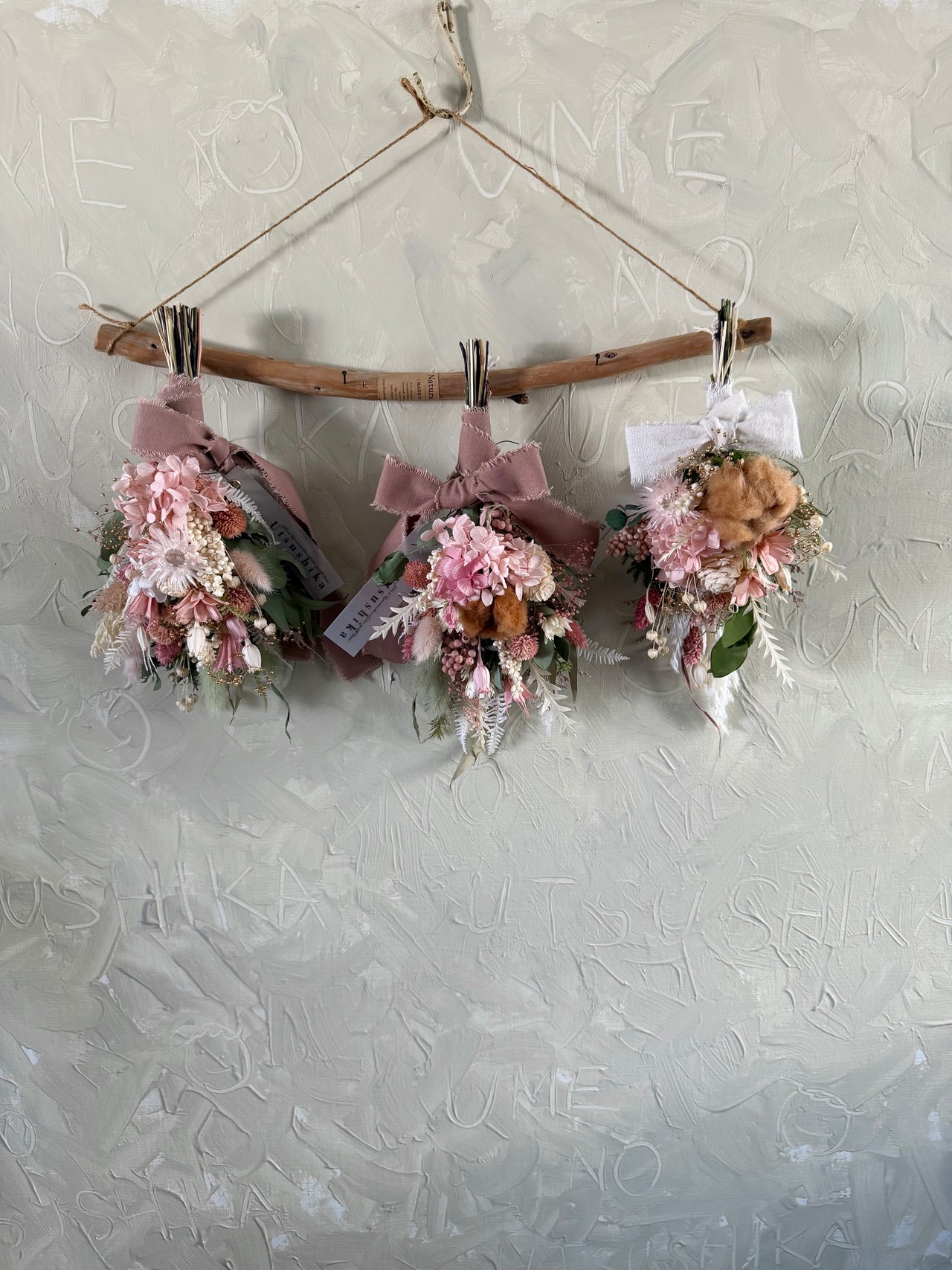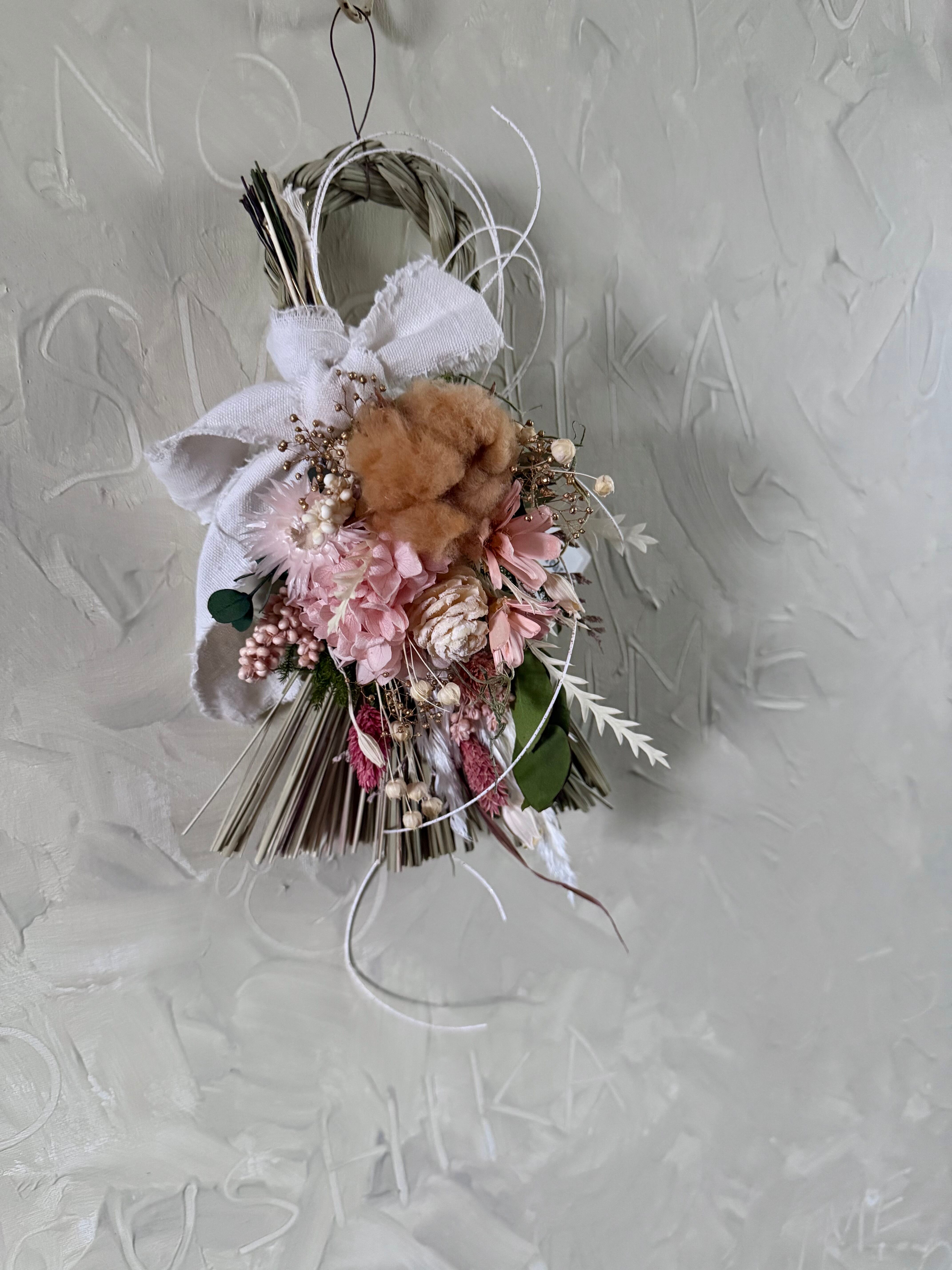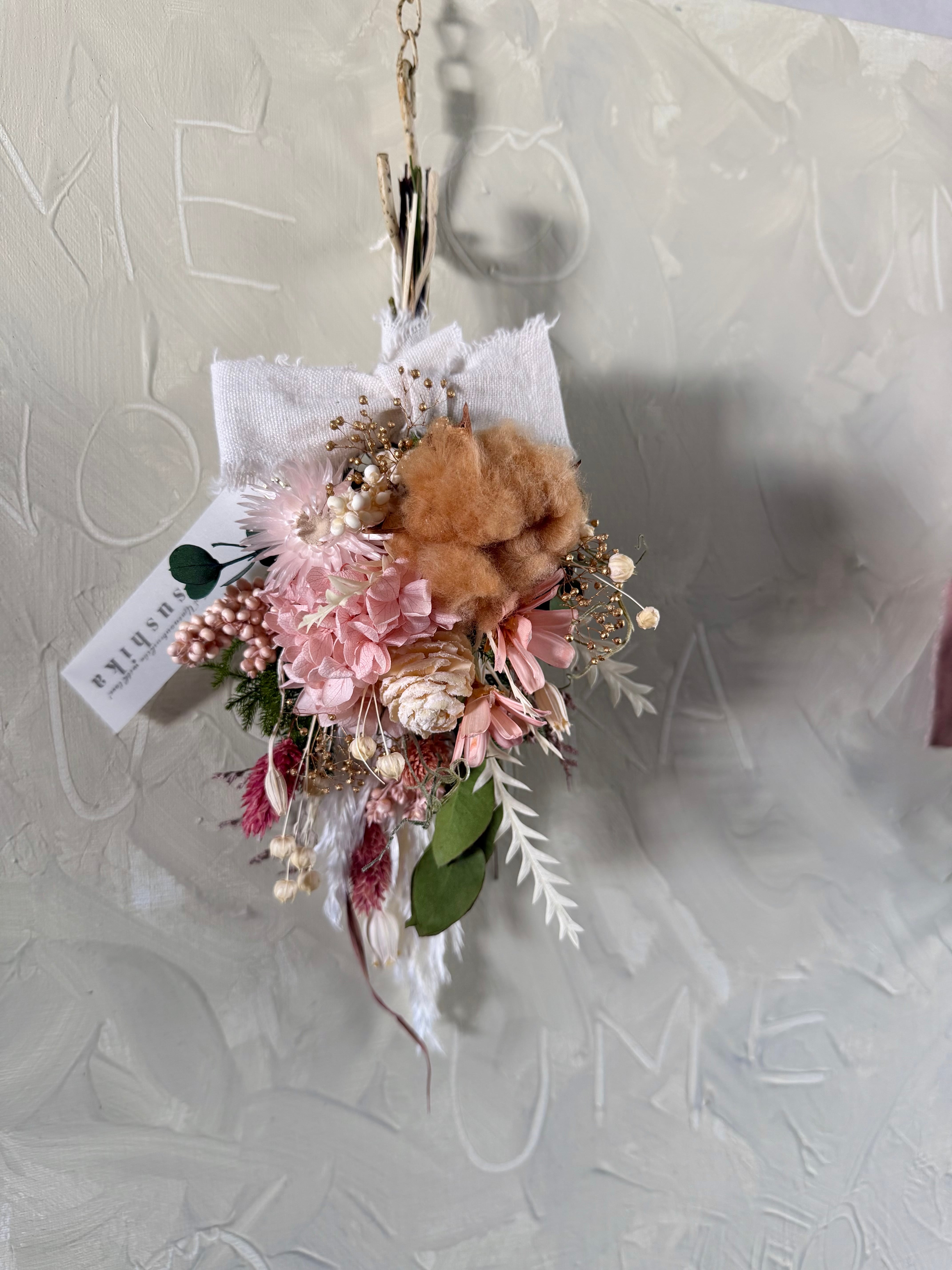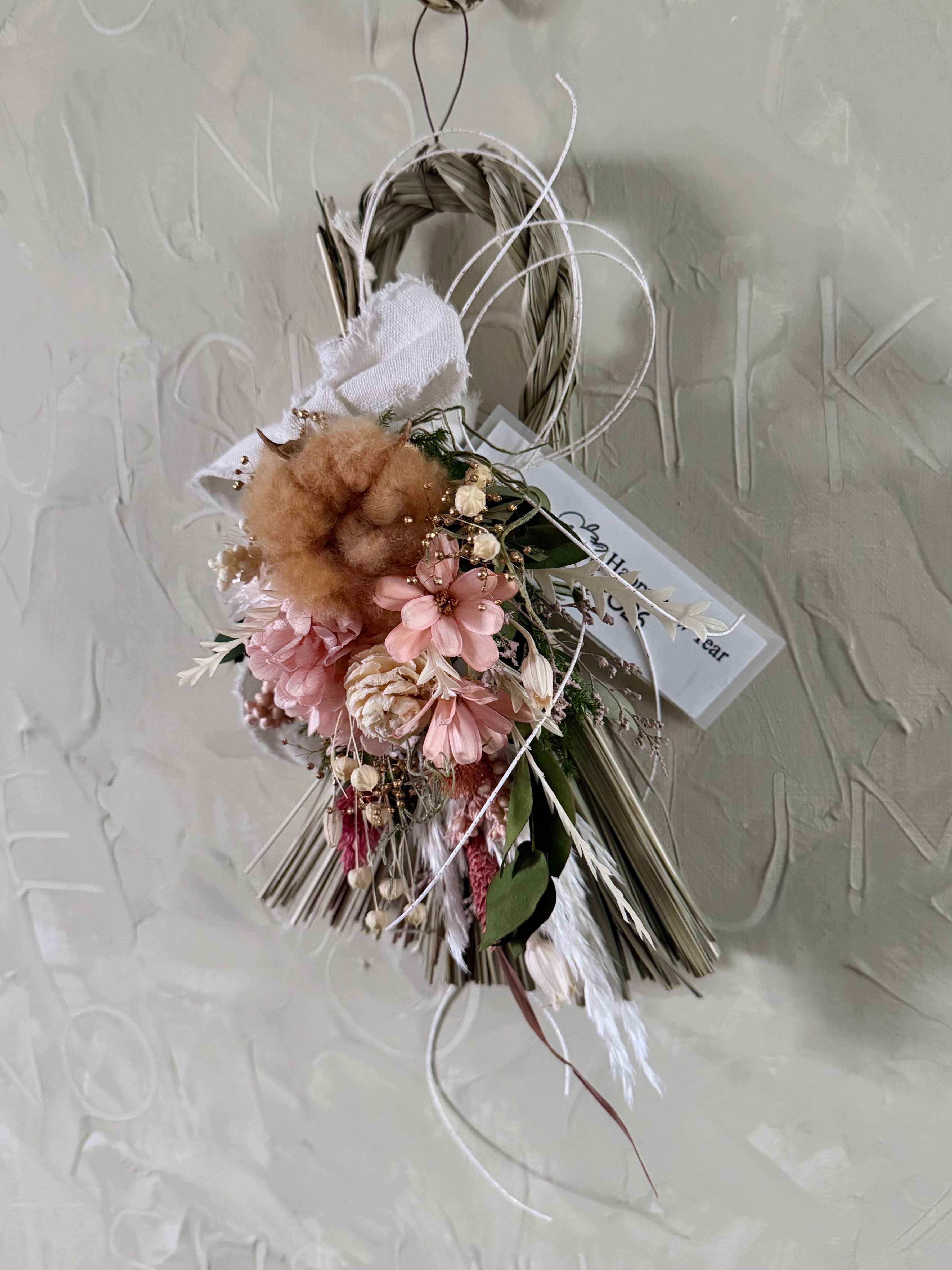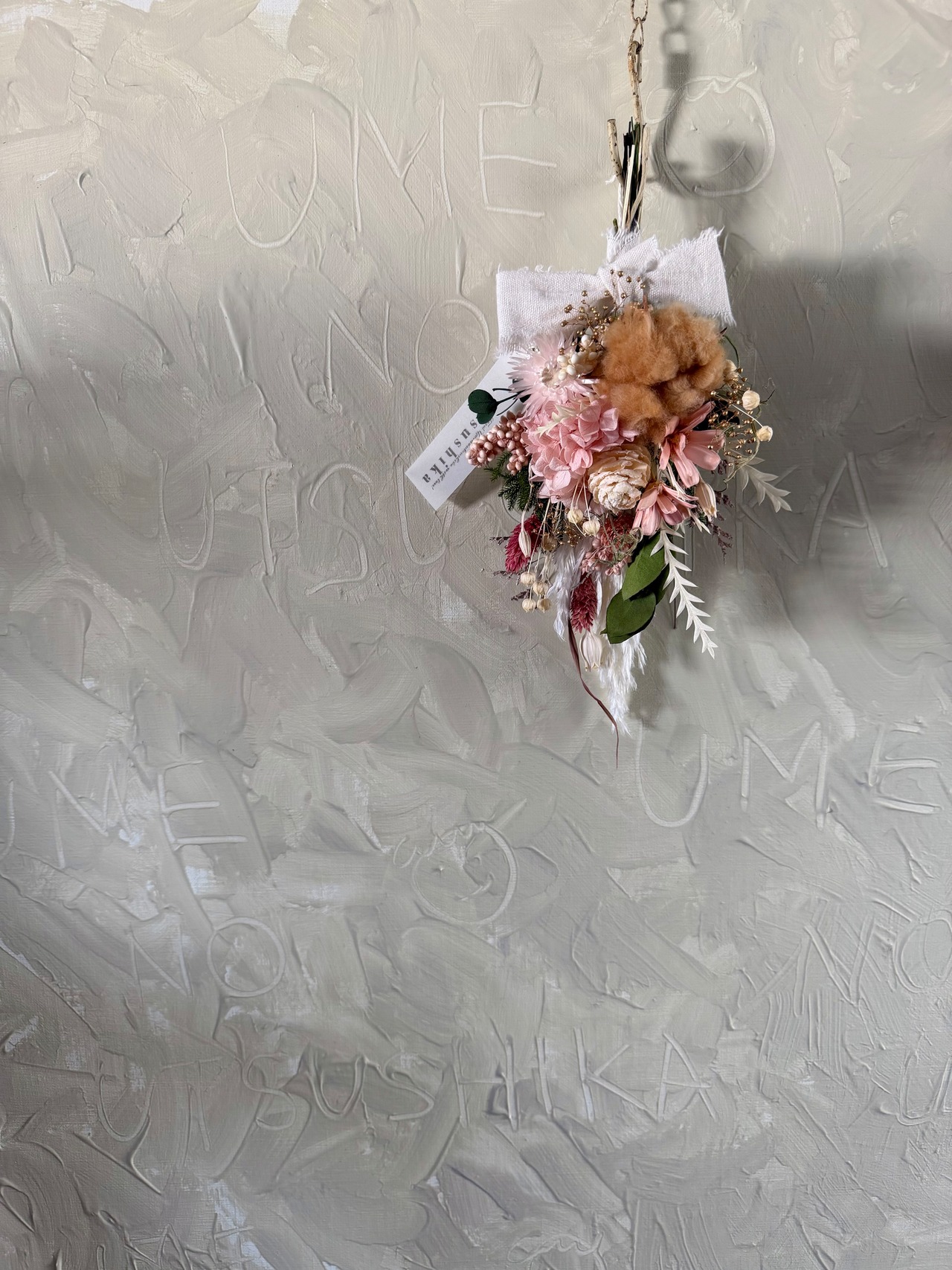 優しいブラウンのコットンフラワーとピンクのお花たちが暖かさを感じさせてくれます。