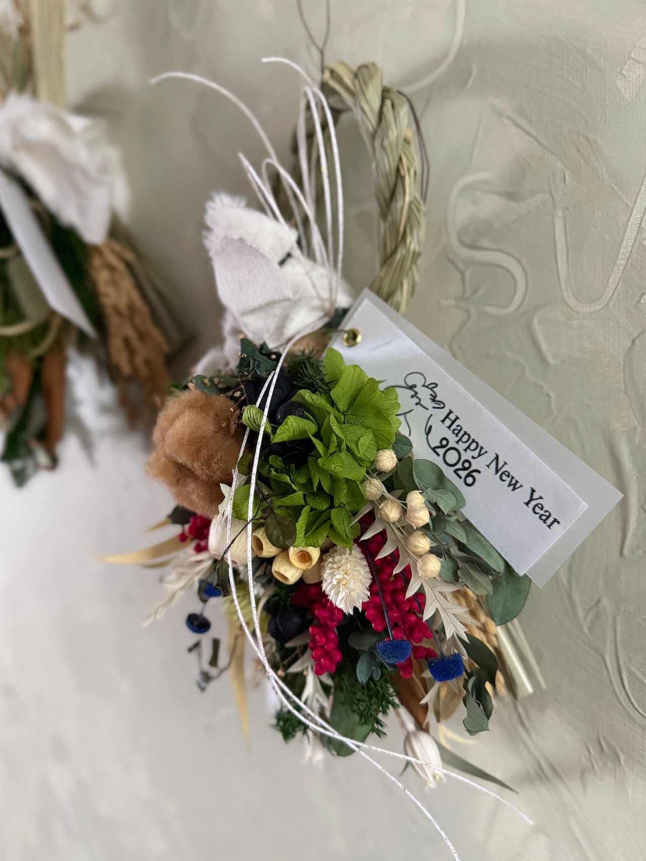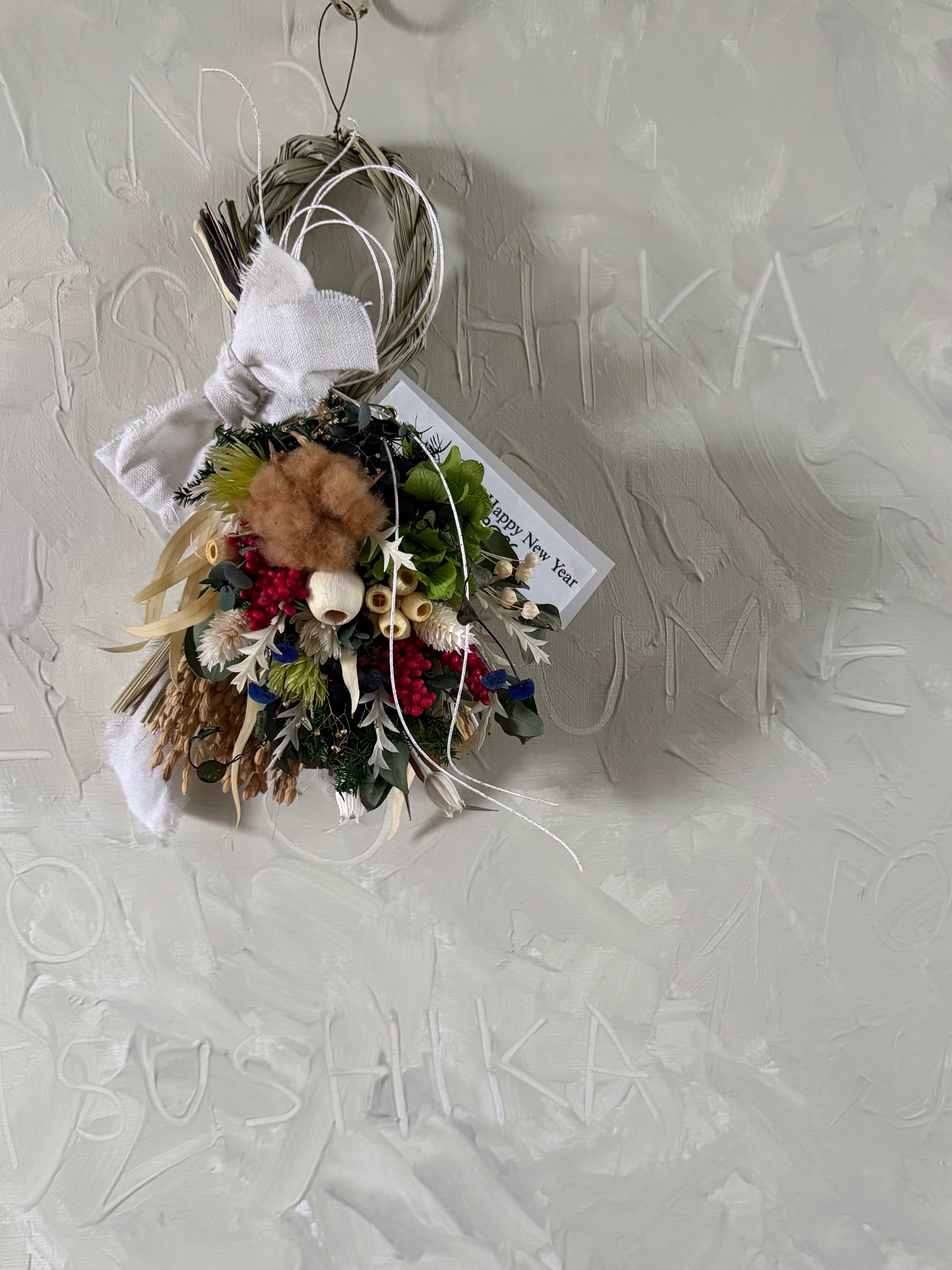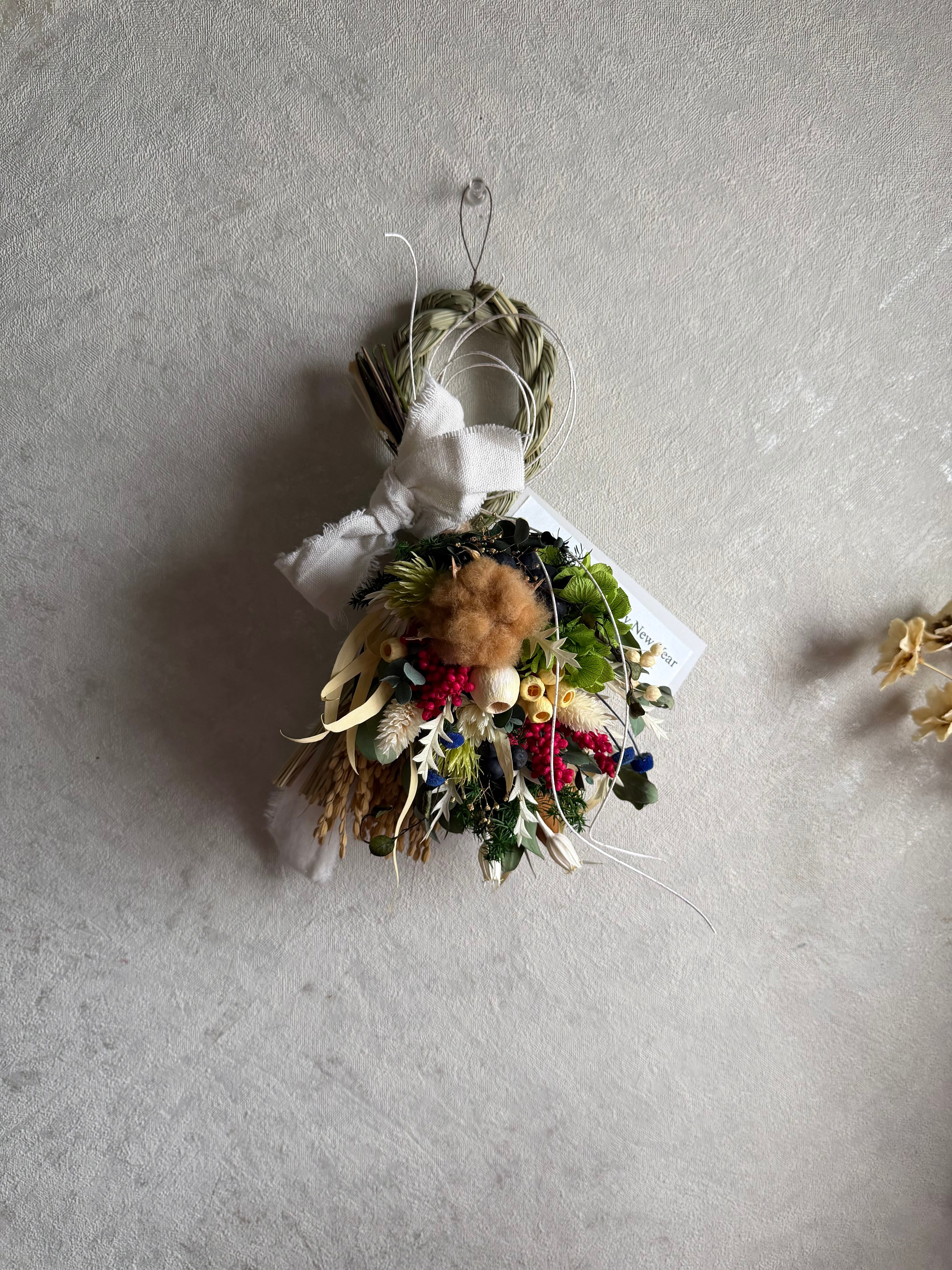 まるで大正ロマンのお着物のような色合いのしめ縄スワッグ。