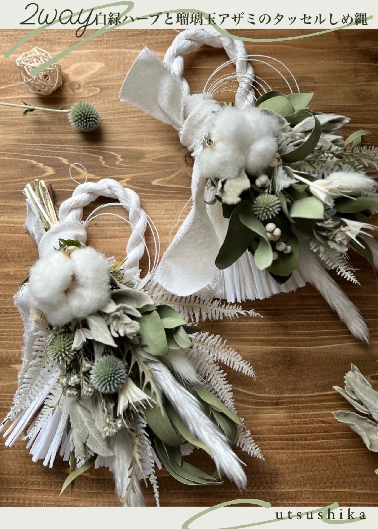 2way白緑ハーブと瑠璃玉アザミのタッセルしめ縄