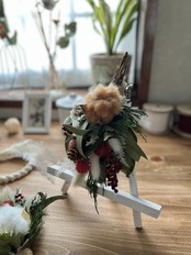 千日紅とコニファー、柊の実やラグラスが
