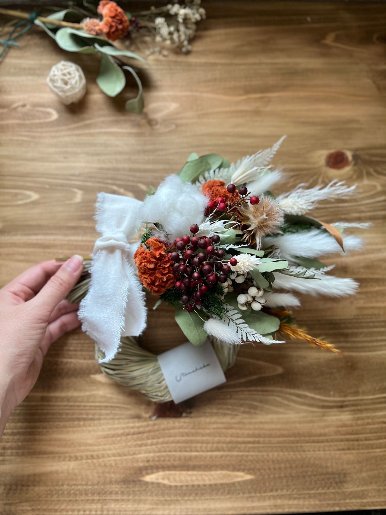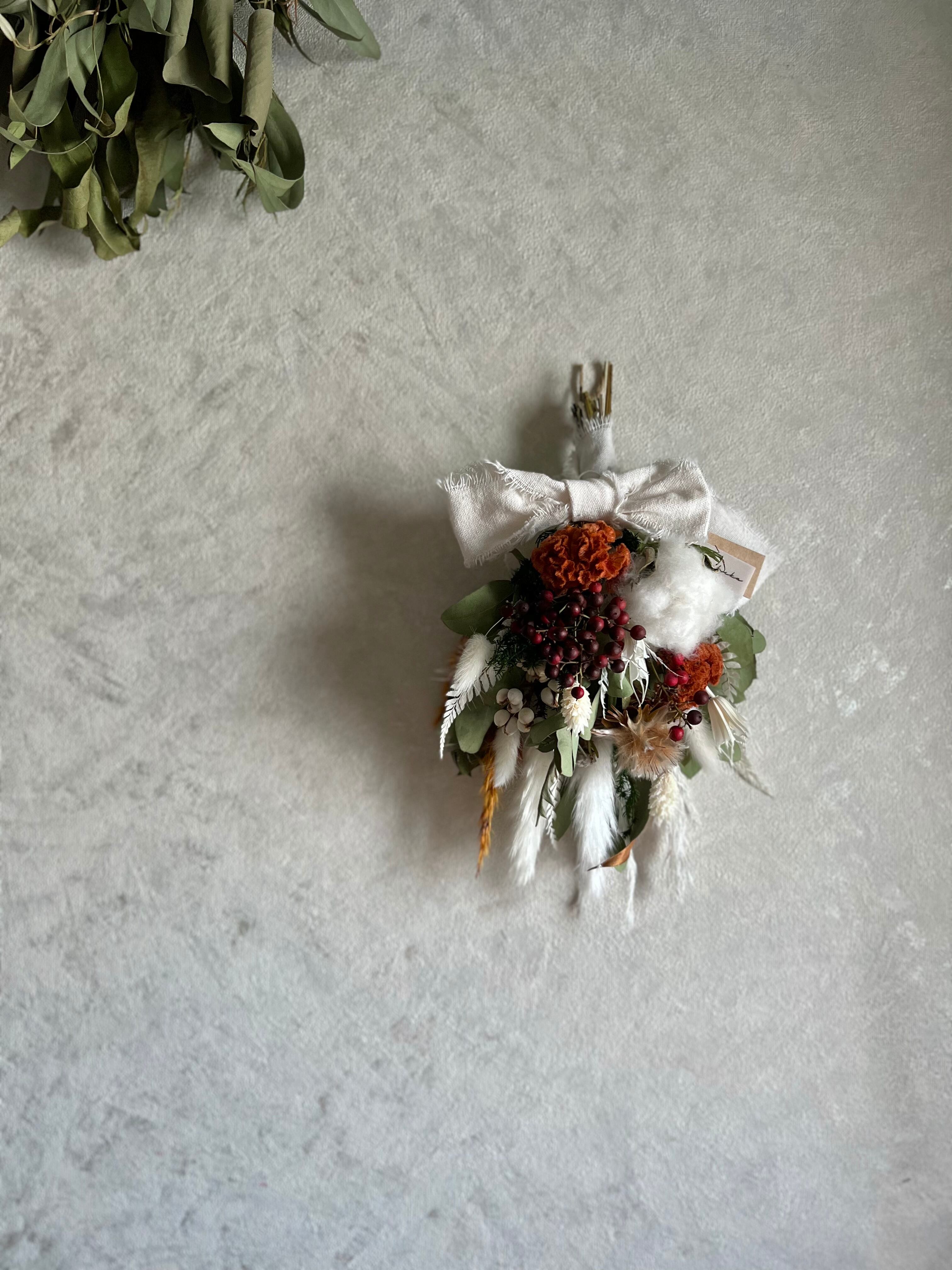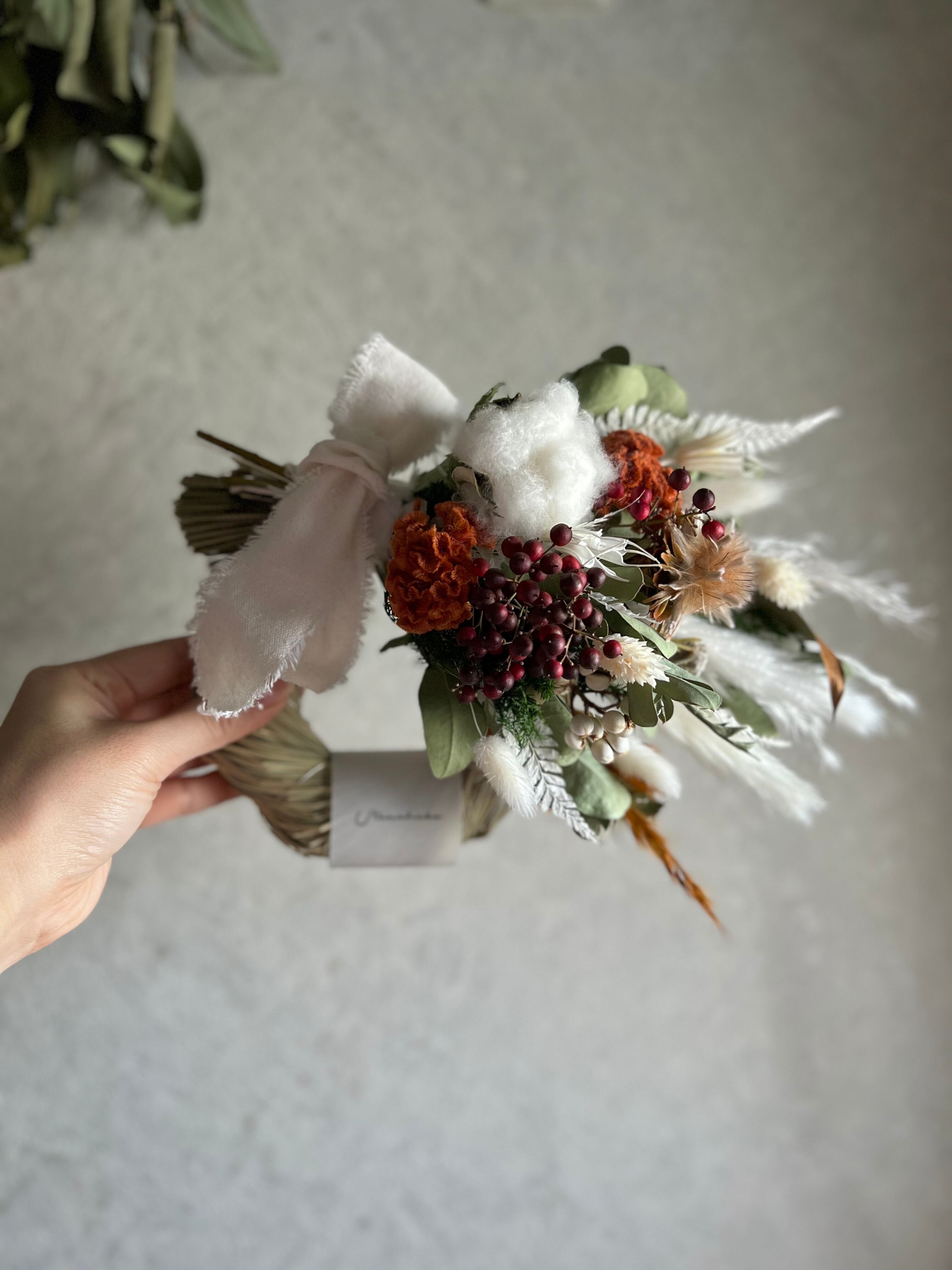 オレンジのケイトウ、コットンフラワーやリードテールのホワイトで