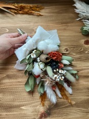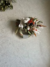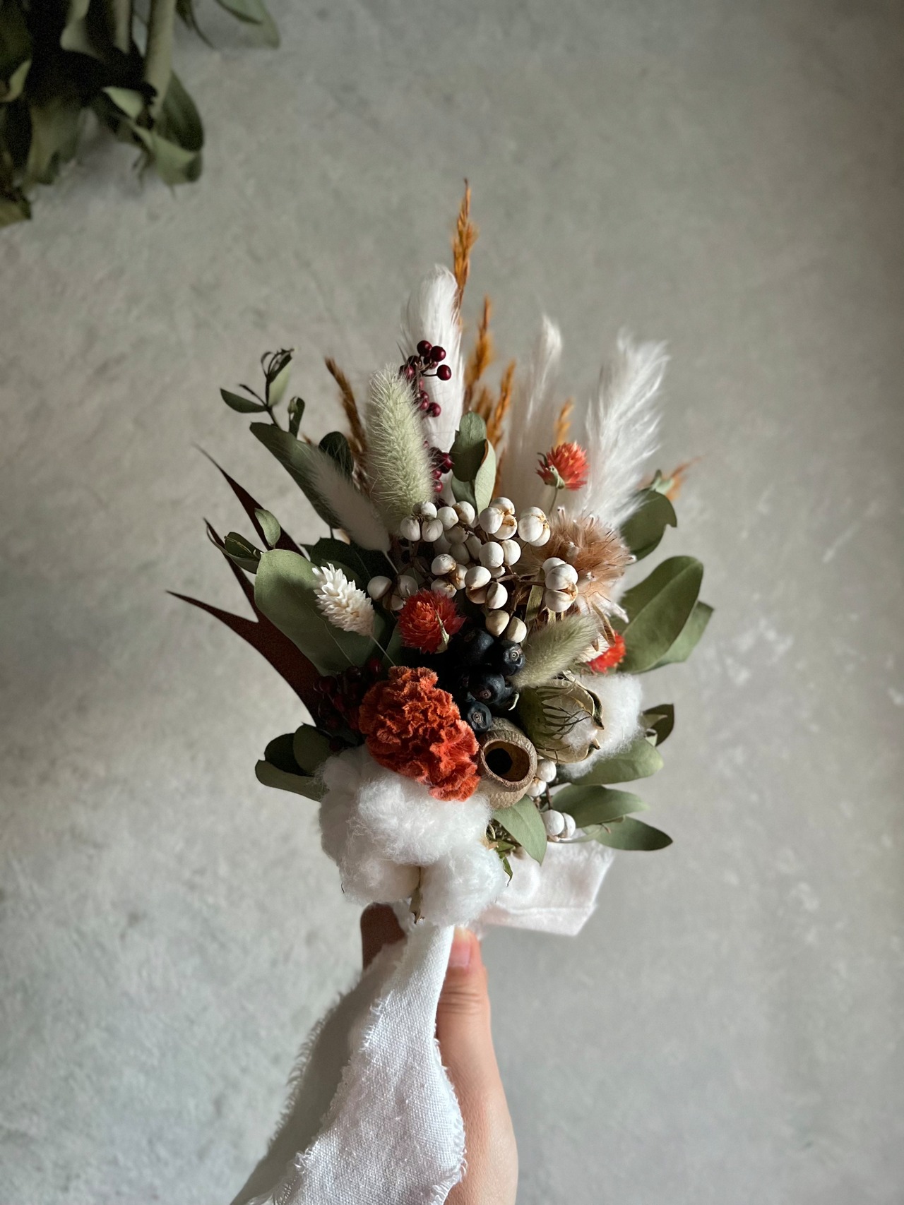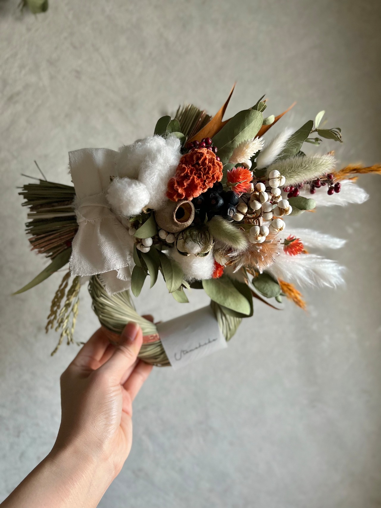 ホワイトのコットンフラワーやテールリードのコントラストが目を惹きますよ。