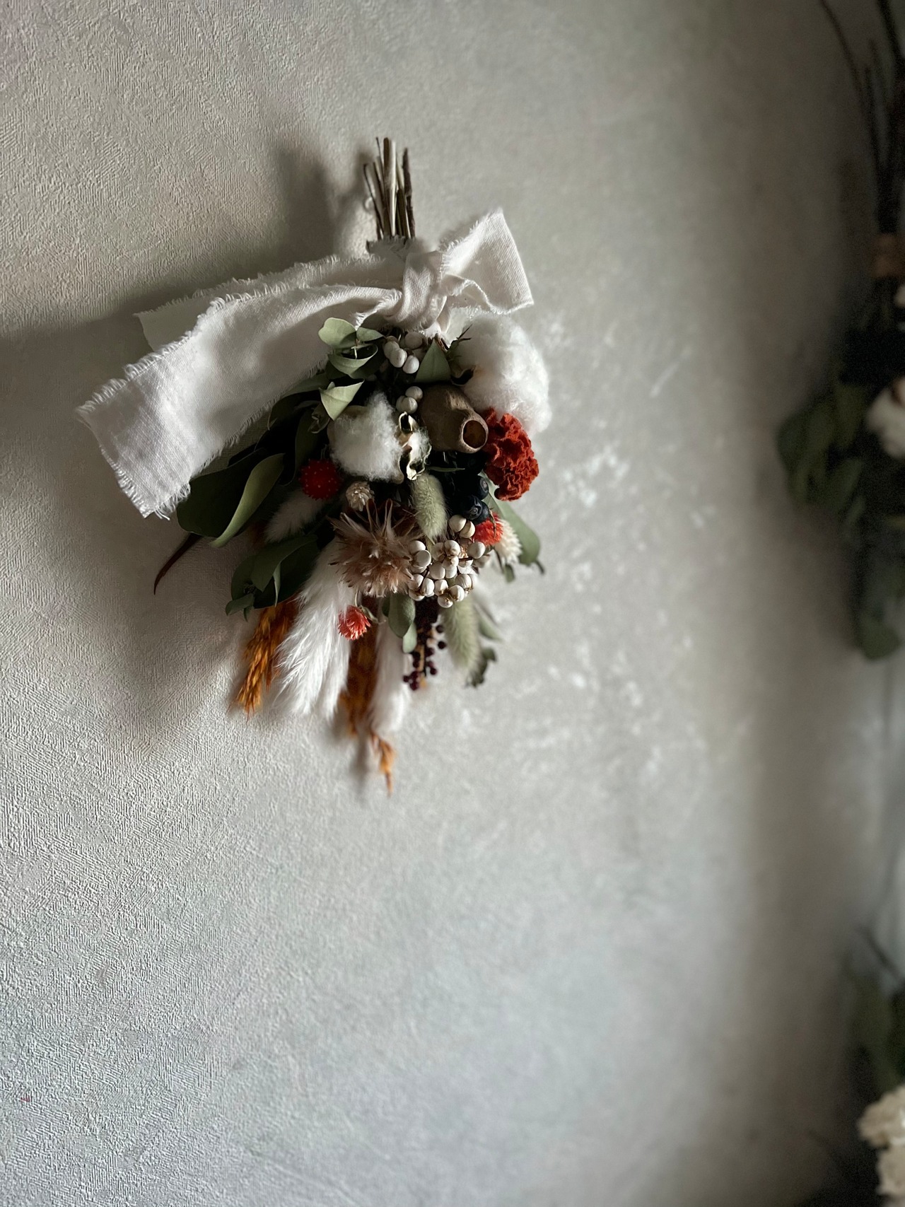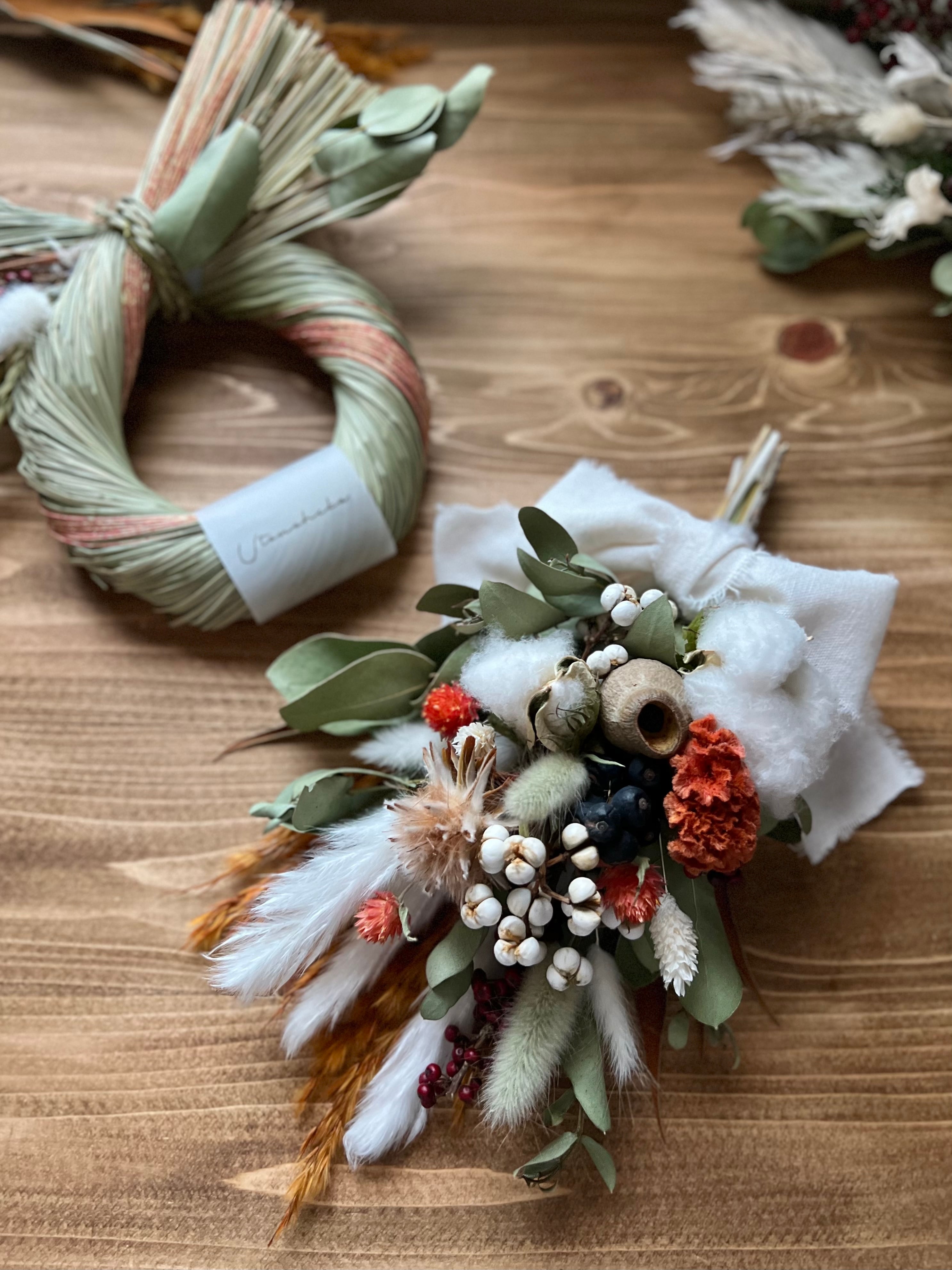 オレンジのニュアンスカラーが暖かな冬の昼下がりのようなパッと明るくなるスワッグです。