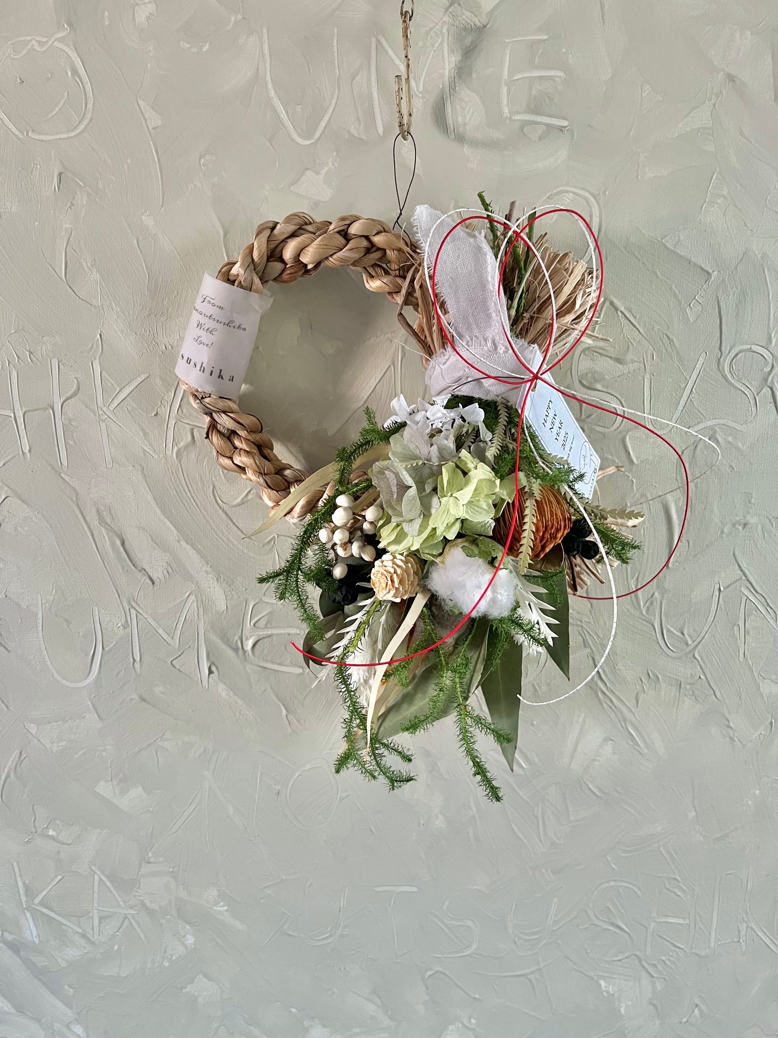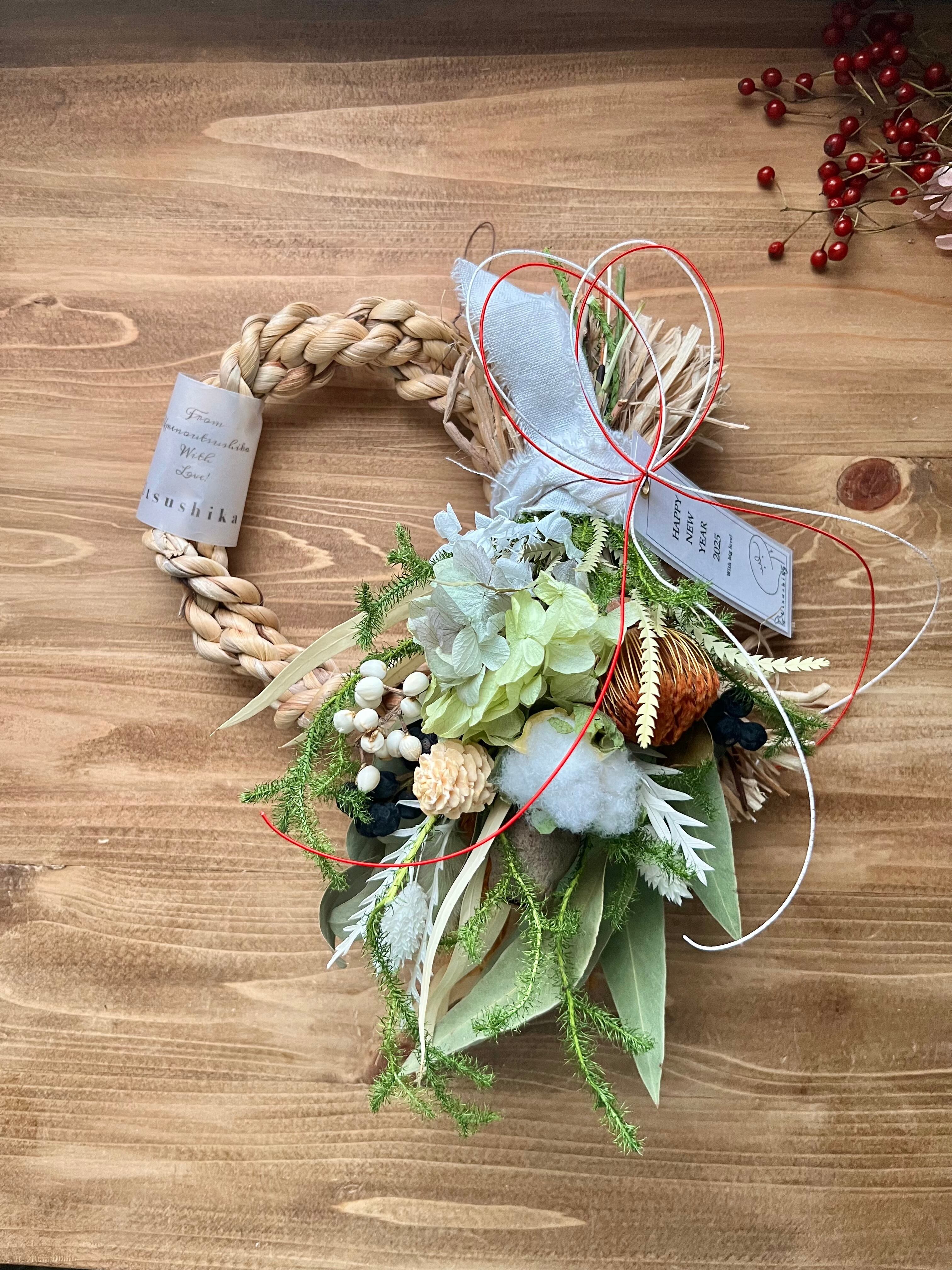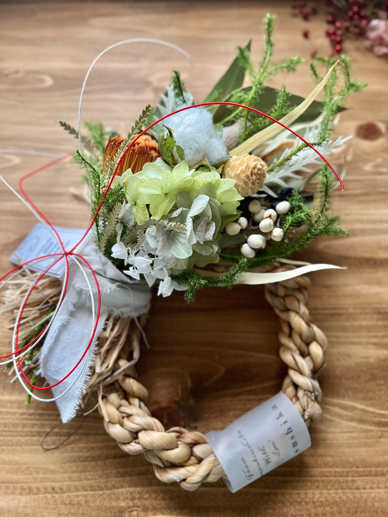 ②紫陽花と綿の実のネイティブな無垢しめ縄スワッグ