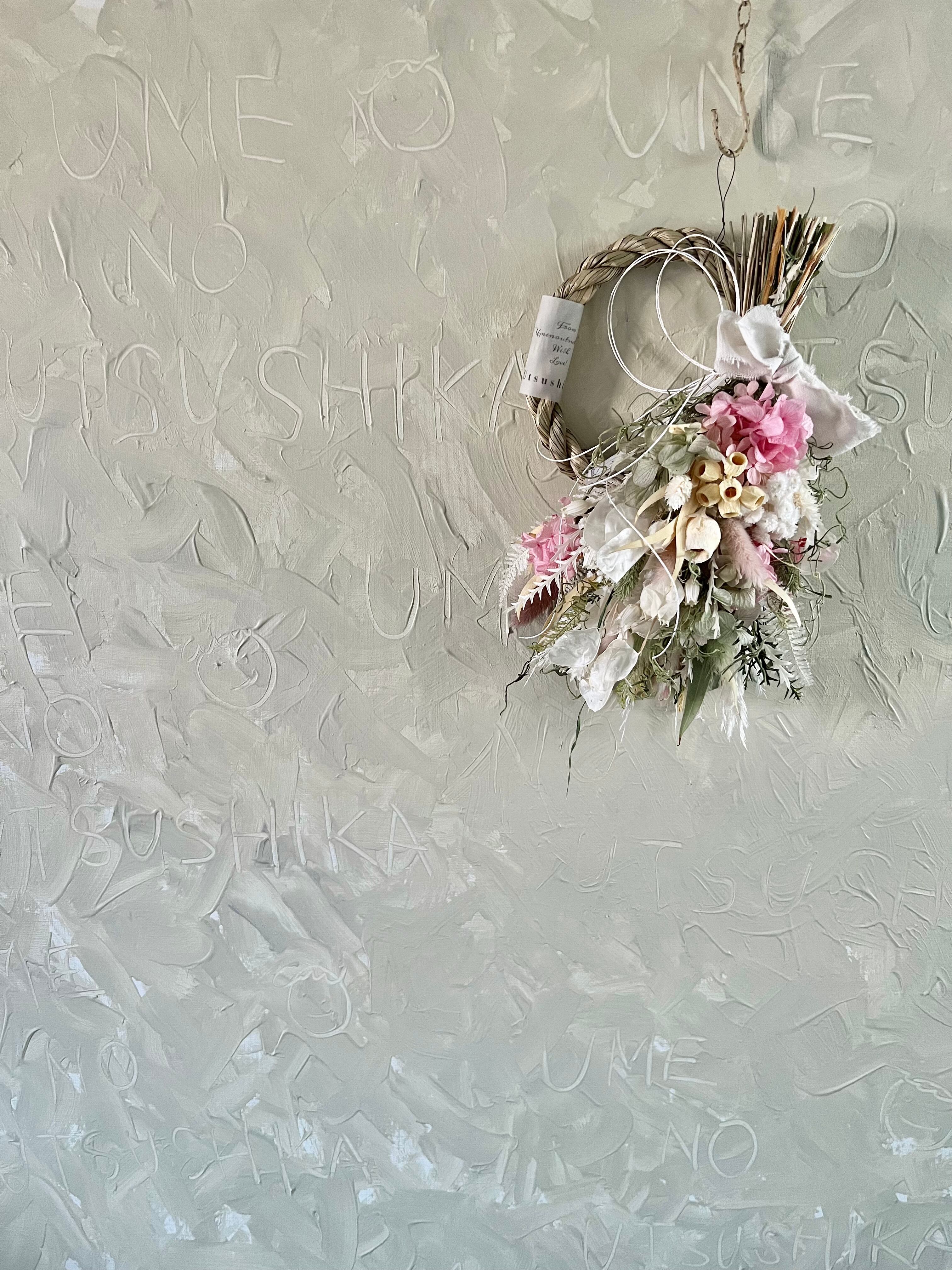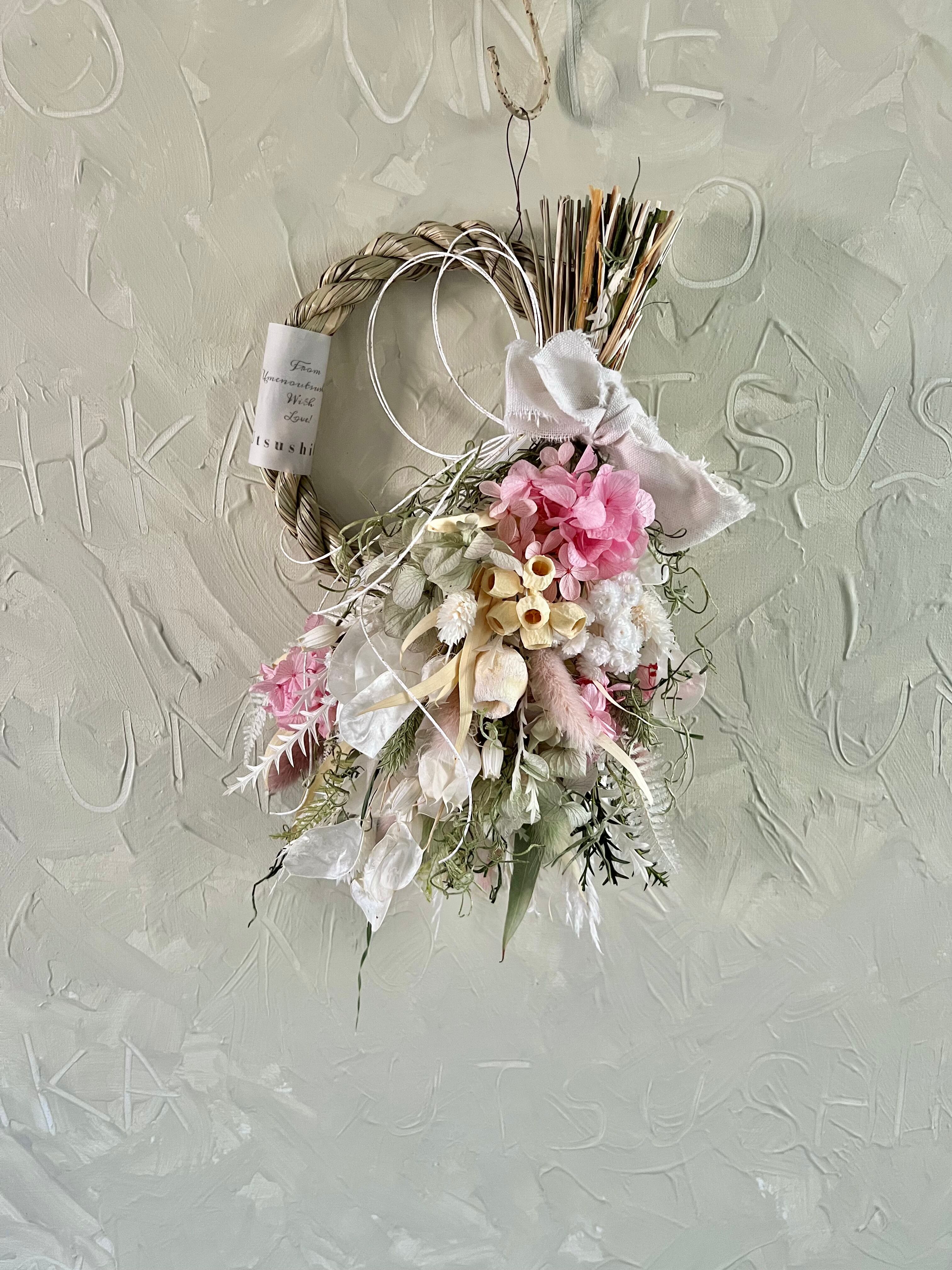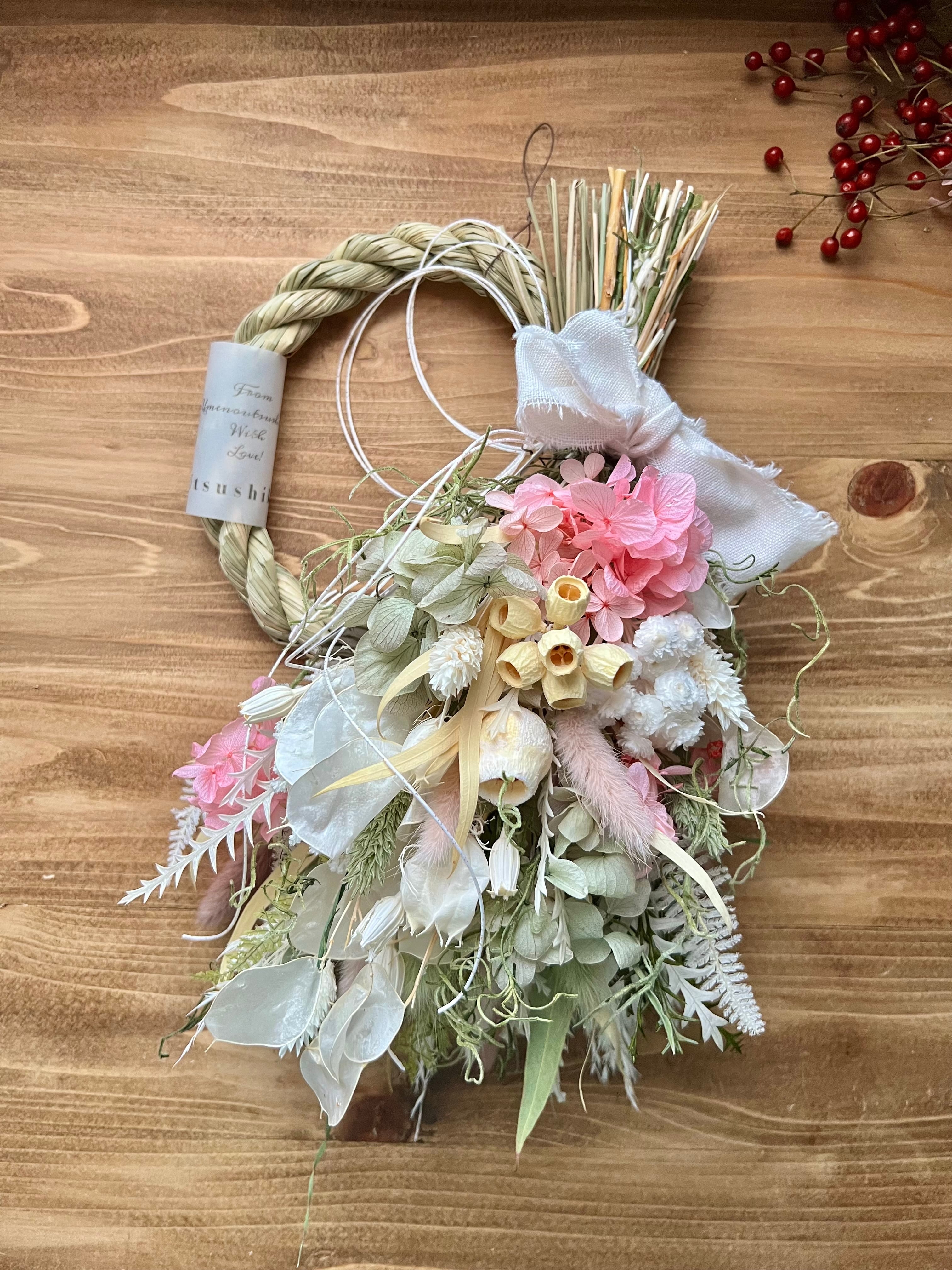 ピンク紫陽花とルナリアのしめ縄スワッグ